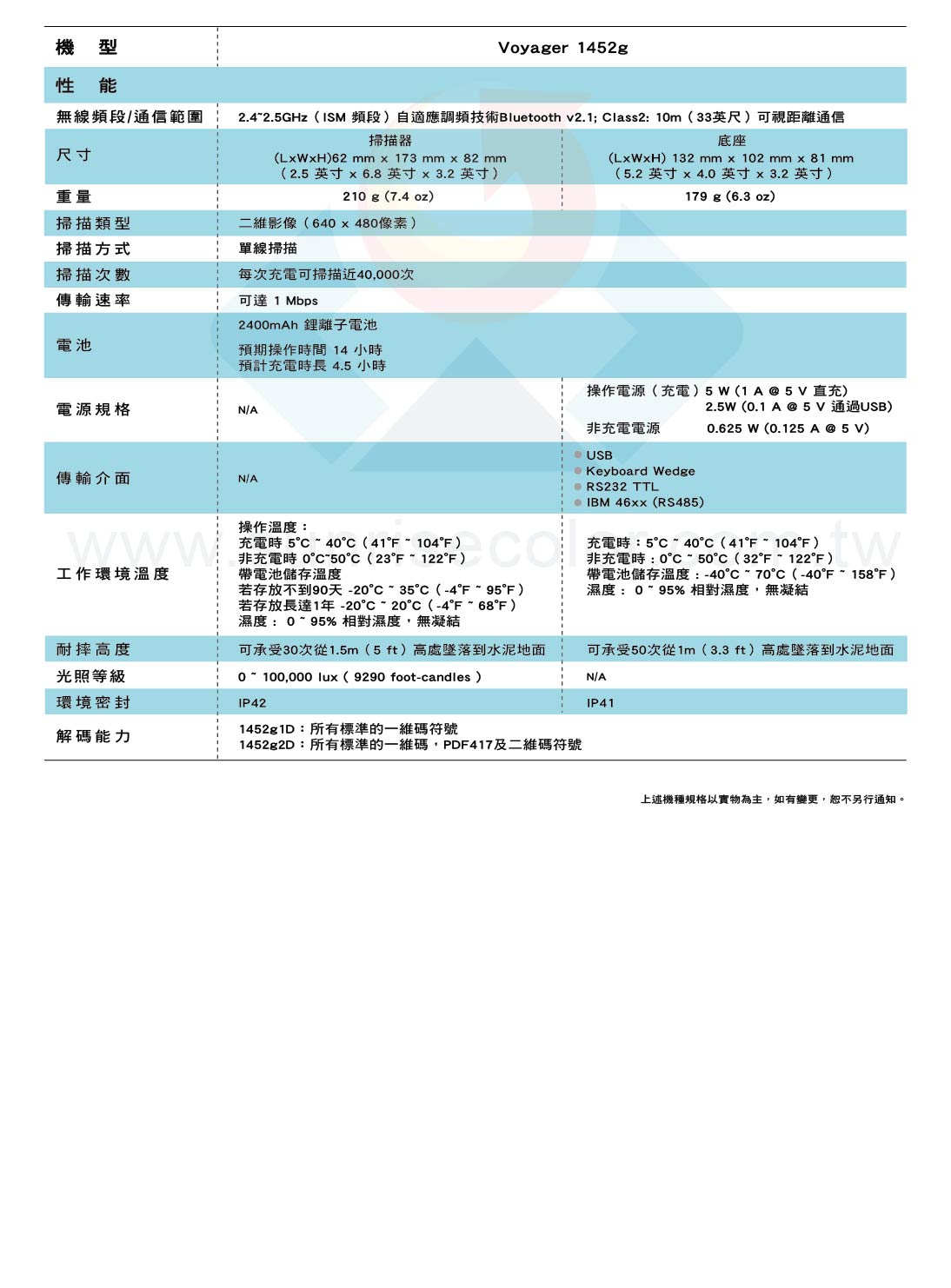 基於Honeywell全球知名的Voyager系列手持掃描器平臺,Voyager 1452g擁有全向讀取一維條碼的功能,並且可以經濟划算地進行設備升級,以實現對PDF和二維條碼的掃描—無論是在購買時,還是隨著資料獲取需求的增加,隨時都可進行升級。集成Bluetooth® Class 2 無線通訊模組,Voyager 1452g可在距離基座10m的範圍內進行無線應用,最大化地增加了操作人員的自由度,同時免除了有繩設備所帶來的麻煩和牽絆。