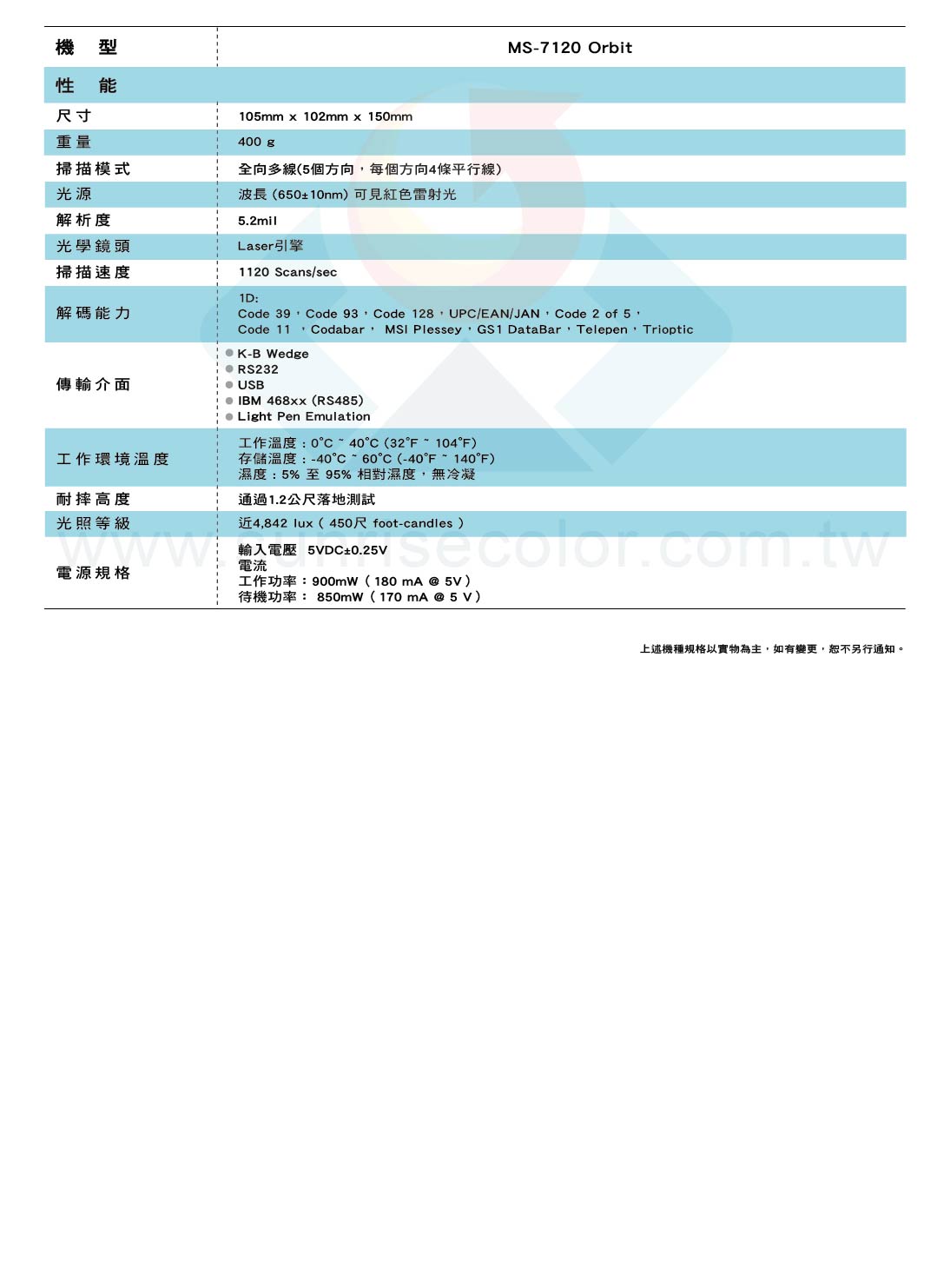 現在,我們將MS7120 Orbit 的設計作了進一步改進,掃描速度達到每秒1,120 次,配備了內置的USB 介面和可以當地語系化程式升級的Flash ROM。藍、白色的LED 指示燈取代了原來的紅、綠色,更加醒目而方便判斷。