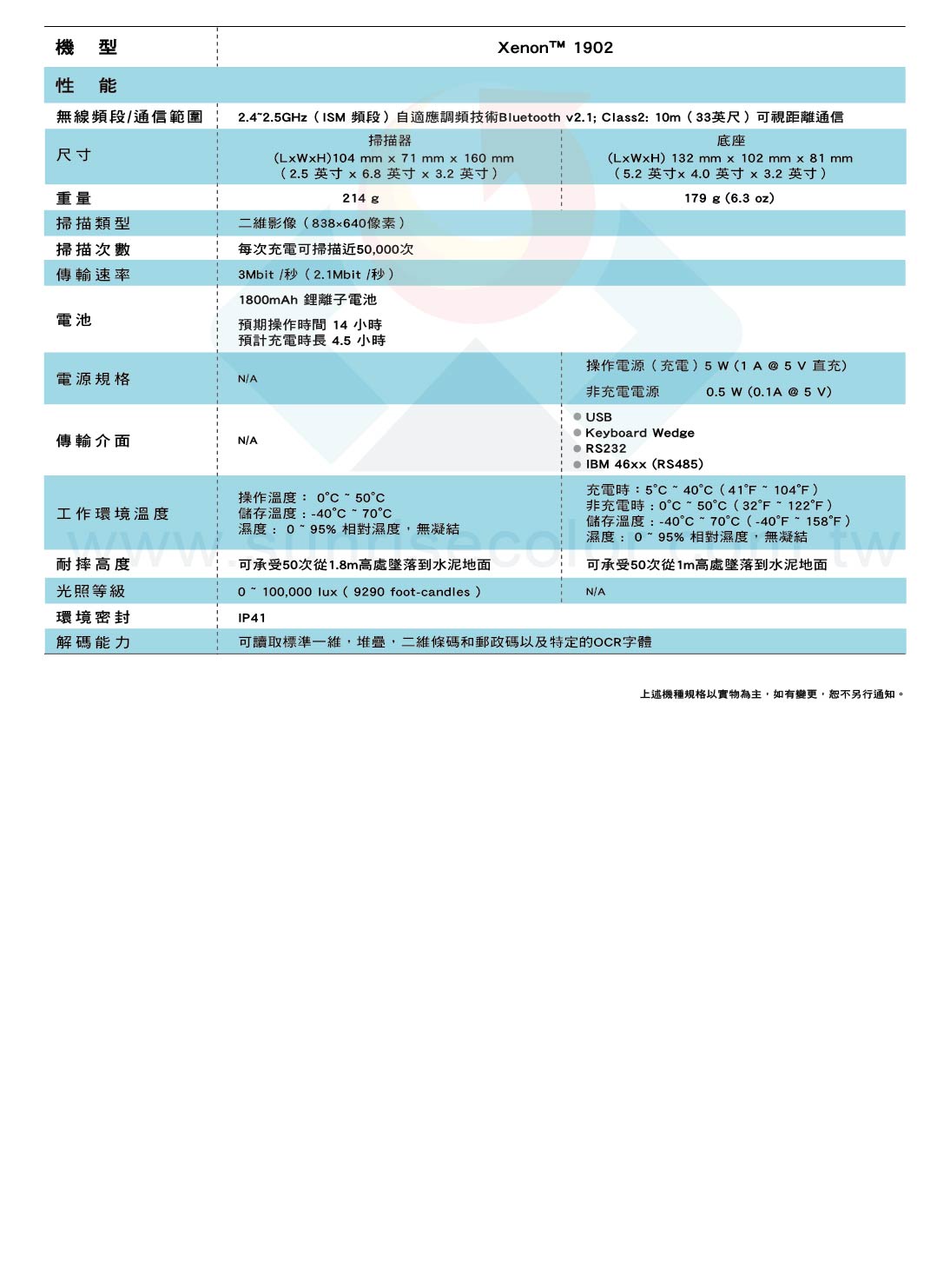 這款無線手持掃描器配備了一個續航能力極強的鋰電池,可確保最大的正常運行時間,它還具有三種對焦選擇,可根據特定掃描應用選擇Xenon 1902採用Honeywell第六代二維影像技術,以優化條碼掃描的定制影像傳感器為特徵,重新定義了手持掃描器的標準。