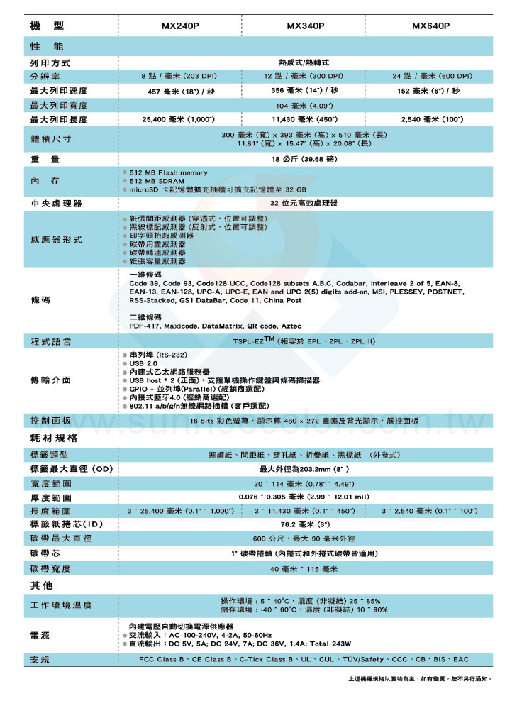 MX240P系列包含203 dpi,最高列印速度達每秒18英吋的MX240P、300 dpi最高列印速度達每秒14英吋的MX340P與600 dpi的MX640P適合於二維條碼、圖示、小字或其他超高解析列印需求之圖形標籤。