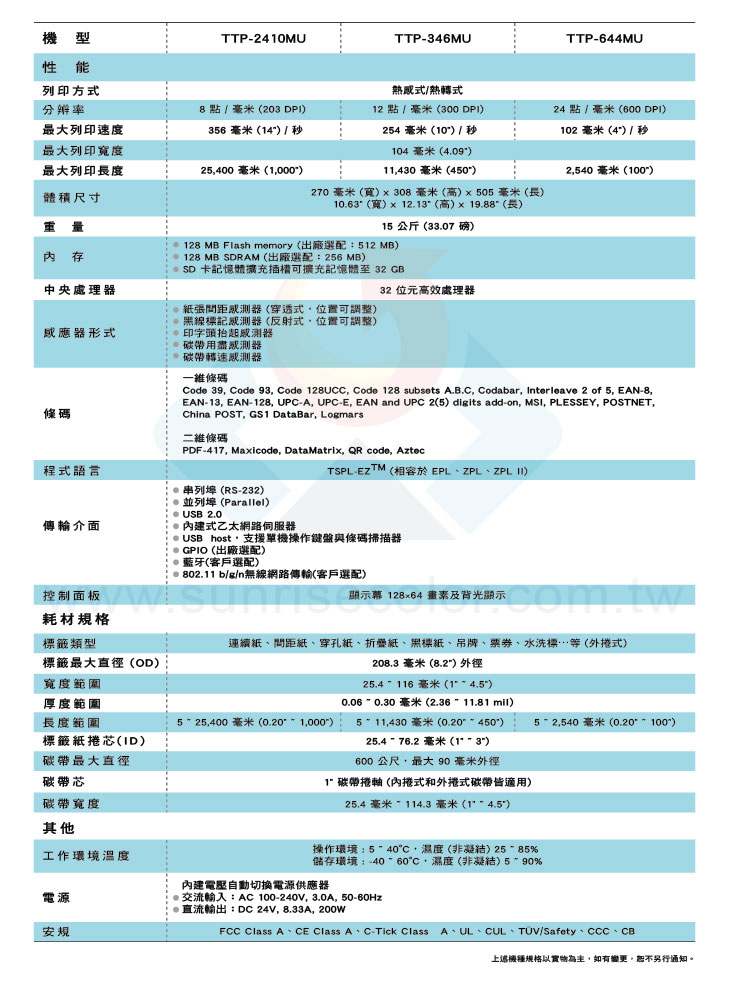 TTP-2410MU系列有三款機種可供選擇,203 dpi之TTP-2410MU列印速度可達每秒14英吋、300 dpi之TTP-346MU列印速度可達每秒10英吋、600 dpi之TTP-644MU適合於二維條碼、圖示、小字或其他超高解析需求之圖形標籤。