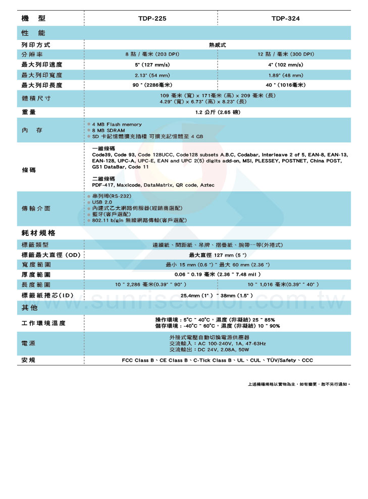 TDP-225系列包含203 dpi解析度版本、列印速度每秒高達5英吋的TDP-225,與新推出300 dpi高解析度,列印速度每秒達4英吋的TDP-324,相較於市場上其他同等級桌上型機種,該系列機種領先推出液晶顯示螢幕之選配,讓您即時掌握列印機狀態,使人機溝通更為簡單。選配設計包括內建式乙太網路伺服器輕鬆整合網路、單機操作鍵盤可因應停機問題。