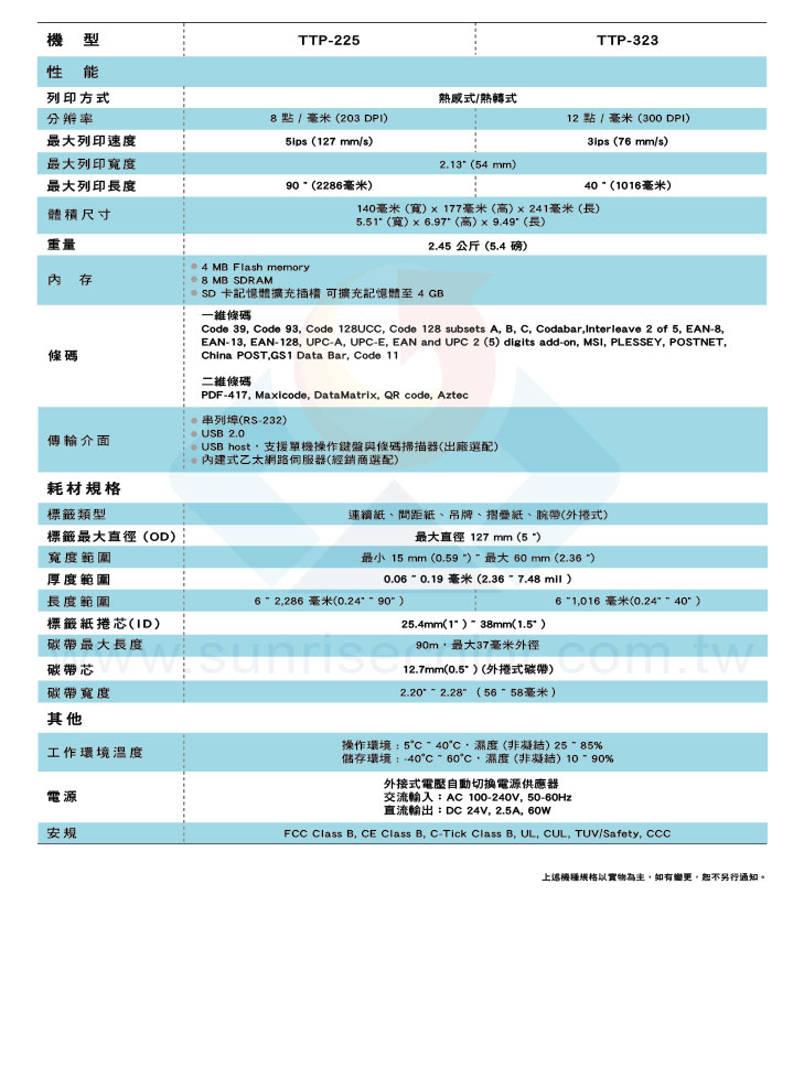 TTP-225 系列搭載高階 32 位元中央微處理器,除 200 DPI 解析度、每秒可達 5 英吋列印速度之 TTP-225 外,同時推出 300 DPI 高解析度、列印速度可達每秒 3 英吋之 TTP-323 ,最適合二維條碼、高解晰度文字,和小圖標籤之列印。